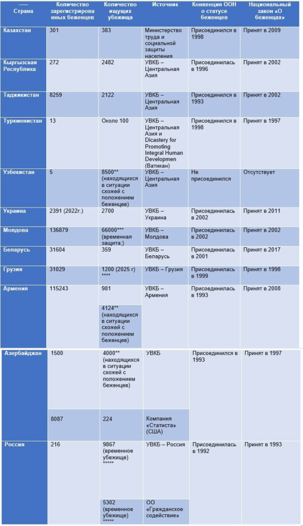 Правды ради нужно сказать, что положение с лицами, ищущими убежище, в Казахстане не является чем-то исключительным для всего нашего региона, хотя ситуация в Афганистане и война в Украине заметно сказались на общей картине. Поэтому Таджикистан выделяется на фоне своих центральноазиатских соседей, Молдова, Беларусь и Россия столкнулись с наплывом бегущих от военных действий в Украине, а Армения записала всё покинувшее население с занятого Азербайджаном в 2020 году Карабаха в беженцы.