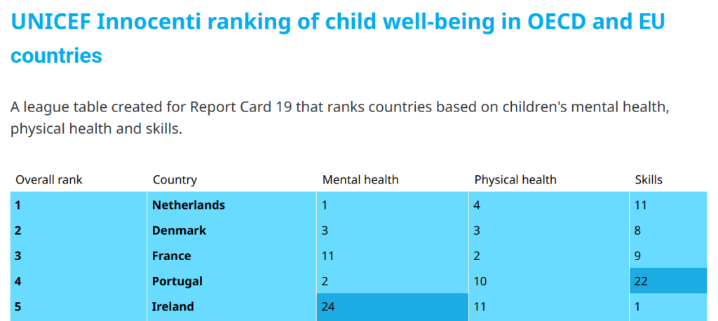 Статистика ранжирована по показателям психического благополучия, физического здоровья и навыков детей и подростков.