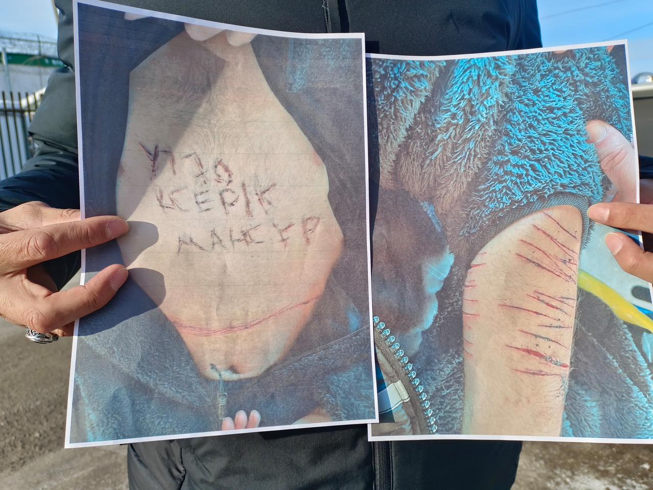 Как продолжает дальше описывать Адиль Тулкибаев, 23 января этого года А.Нысаналиев «доведённый до крайнего психоэмоционального состояния систематическими провокациями, унижениями и игнорированием его законных просьб со стороны сотрудников учреждения, нанёс себе телесные повреждения — порезал руку и выцарапал на груди имена «Мансур» и «Серик», которые, по его словам, являются оперуполномоченными Учреждения №70 и непосредственно причастны к оказываемому на него давлению».